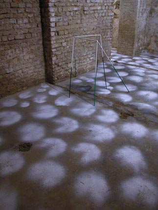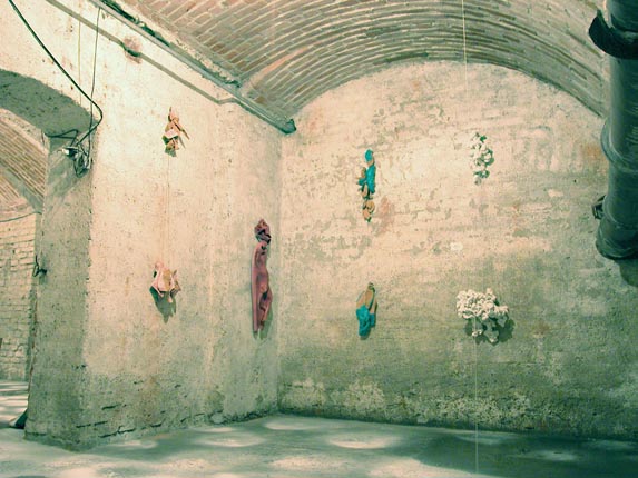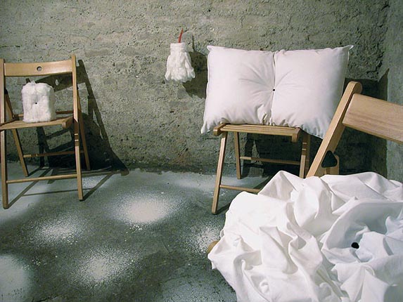 “Così io sono assorta” è la frase scritta accanto all’altorilievo di una figura femminile adagiata e pensosa, una scultura dei primi decenni del ‘900 che da molto tempo abita la cantina della Casa degli Artisti. Ho immaginato la mostra come un ricordo nella testa della donna scolpita, come un’immagine che lei sta pensando dentro di sé. È un’immagine pervasa da una luce strana, come in una nevicata, aloni bianchi spruzzati sul pavimento, creano una base leggera e vaporosa alle opere e al visitatore.