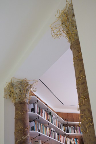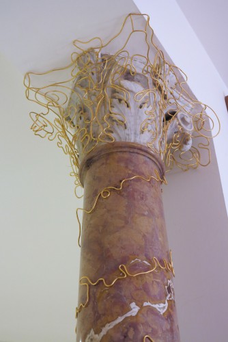 Questa l’idea: modellare un filo di ferro rivestito di foglia d’oro zecchino immaginato come una linea luminosa emessa dallo stesso capitello, una linea che, sfiorando le forme, produce un movimento vitale e gioioso ricreando l’interezza di ciò che è stato spezzato.