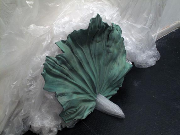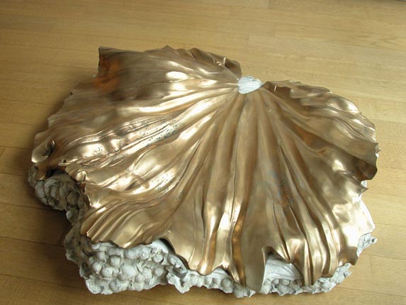Foglia madre perché è adagiata su un “cuscino” di gesso che richiama un terreno carico di semi, un terreno che il corpo della foglia, sembra tenere in caldo. Quello che voglio è trovare un’immagine in grado di trasmettere la fisicità della vita. La foglia di bronzo origina dal calco di cera del modello di argilla sagomato nel profilo della foglia di vite. La foglia prende man mano forma attraverso un procedimento per cui l’argilla è come “agitata” fino a che non acquista il movimento delle pieghe che la animano.