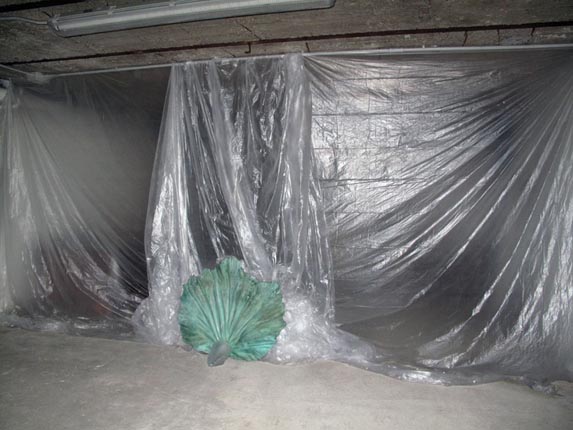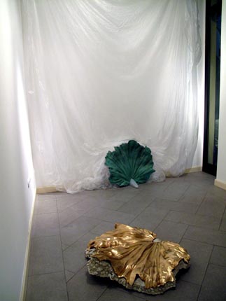 È una grande foglia di bronzo, che trae somiglianza dalla foglia della vite, concepita come un organo pneumico che si riempie d’aria per soffiarla fuori energicamente. L’aria è modellata e raccolta da un cellophane, leggerissimo, che dal soffitto scende e si accartoccia dietro la foglia, spuntando con uno sbuffo dall’ansa del picciolo. Il soffio che sembra emettere fa pensare a una pernacchia. Pernacchia per beffarsi dell’atmosfera che c’è attorno, in particolare mi riferisco al mondo dell’arte, a tutto quello che rimane, nonostante tutto, indifferente, ottuso, taccagno, gretto, cialtrone, accomodato.