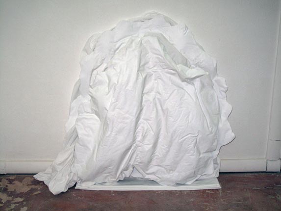 Una massa di gesso è solidificata nelle sembianze di una foglia, un’altra nella funzione di cuscino d’appoggio, tra esse vi è un lenzuolo piegato in maniera scomposta, l’insieme appare come un po’ gonfiato e dà l’idea di un corpo unico, come se la foglia di gesso originasse dal lenzuolo e viceversa, come corpi resi simili.
